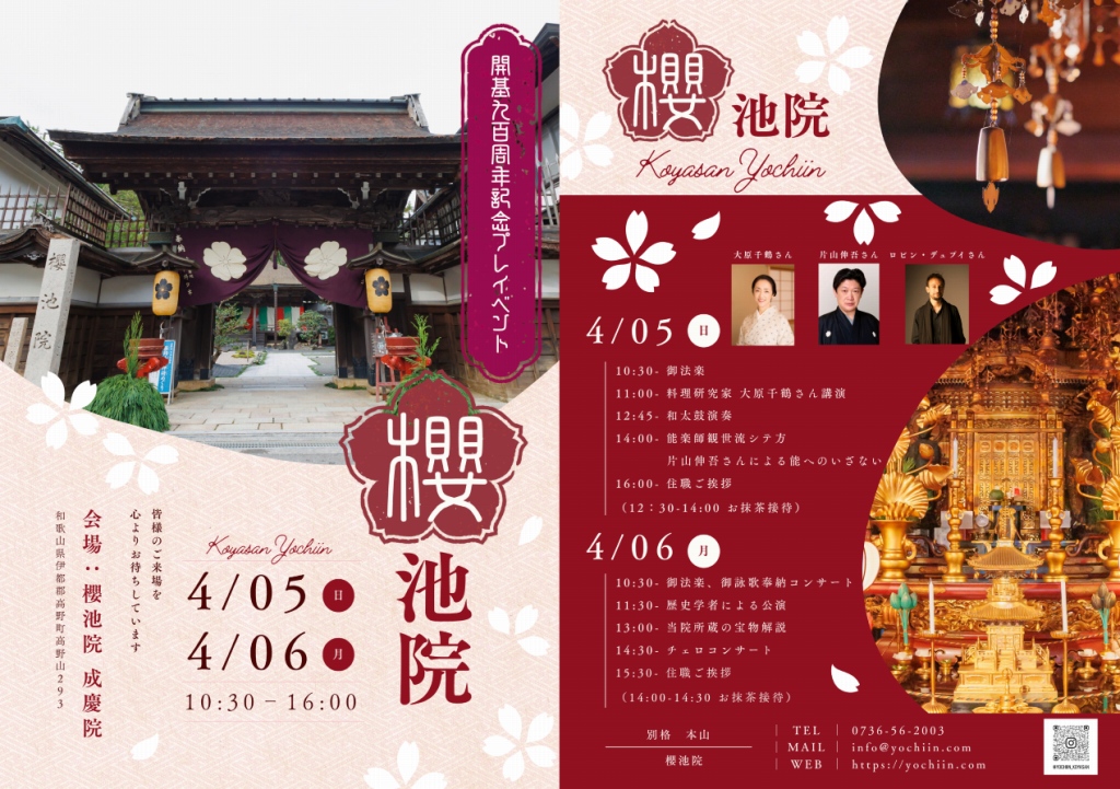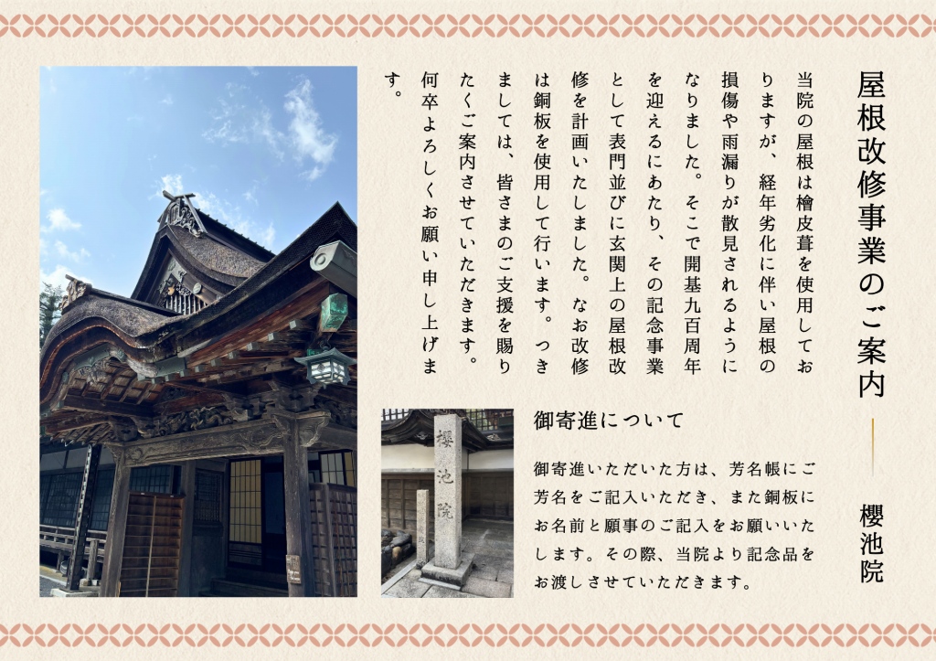 歴史ある櫻池院を次の時代へとつないでいくためには、私一人の力では到底及びません。どうか今後とも変わらぬご支援とご協力を賜りますようお願い申し上げます。そして、900周年記念イベントへのご参加を心よりお待ちしております。